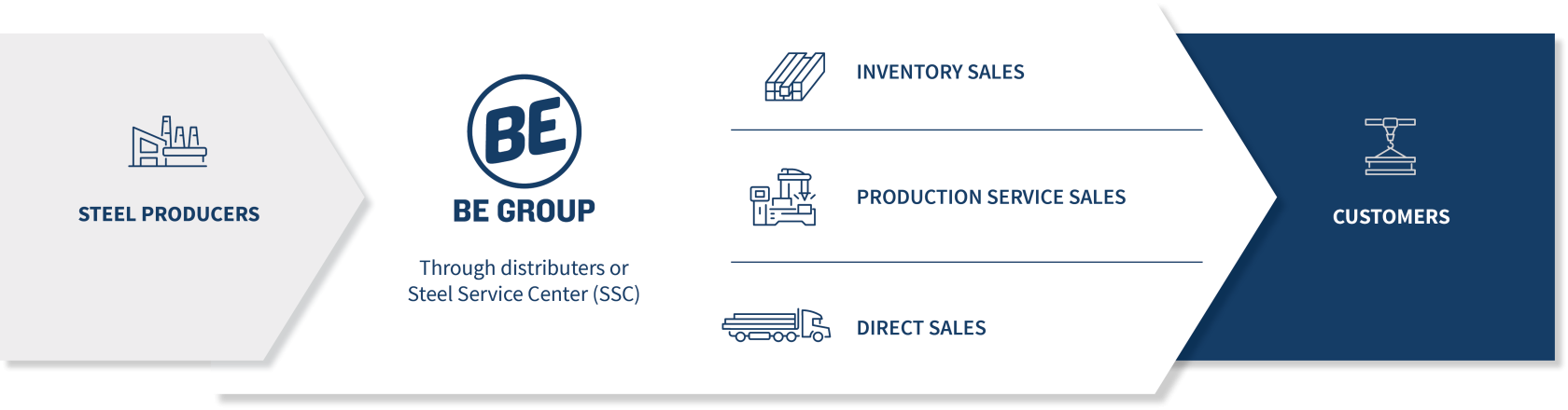 Direct sales mean that BE Group sells and delivers large volumes of materials to customers directly from the production of the steel and aluminium mills.